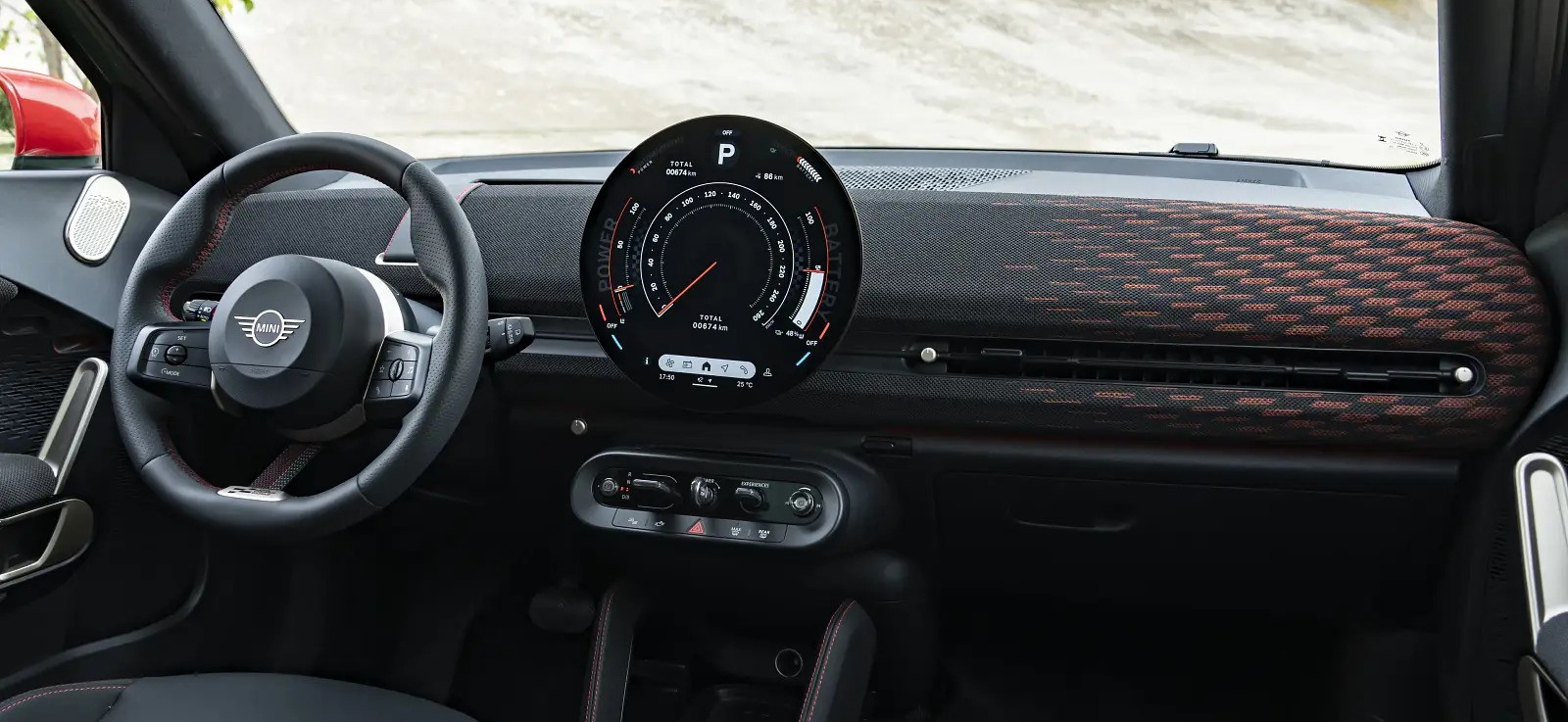 Στο εσωτερικό, τα JCW μοντέλα ξεχωρίζουν με τα σπορ καθίσματα, ντυμένα με συνθετικό δέρμα και ύφασμα με κόκκινες ραφές, ενώ το ταμπλό καλύπτεται από μαύρο και κόκκινο ύφασμα, δημιουργώντας έναν δυναμικό και τεχνολογικά προηγμένο χώρο.