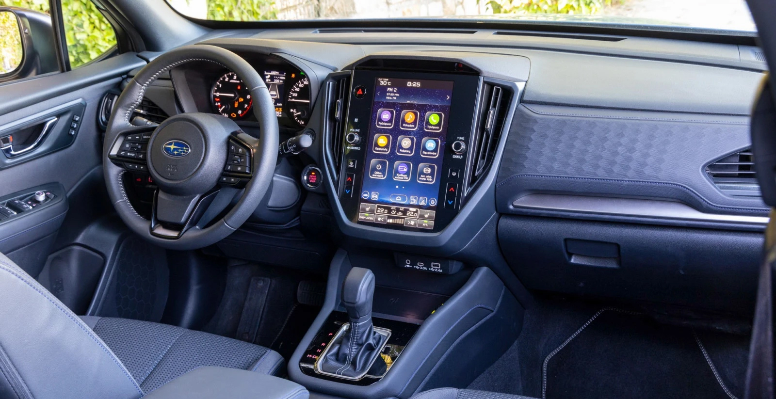 Η εικόνα του εσωτερικό είναι σύγχρονη και κυρίως, πρακτική. Δίνοντάς σου την εντύπωση πως οδηγείς το Forester για χρόνια, μιας και όλα βρίσκονται εκεί ακριβώς που τα θέλεις. Στο κέντρο του ταμπλό, ξεχωρίζει η κάθετα τοποθετημένη οθόνη αφής Full HD 11,6” που υποστηρίζει στάνταρ ασύρματη συνδεσιμότητα με Android Auto και Apple CarPlay.