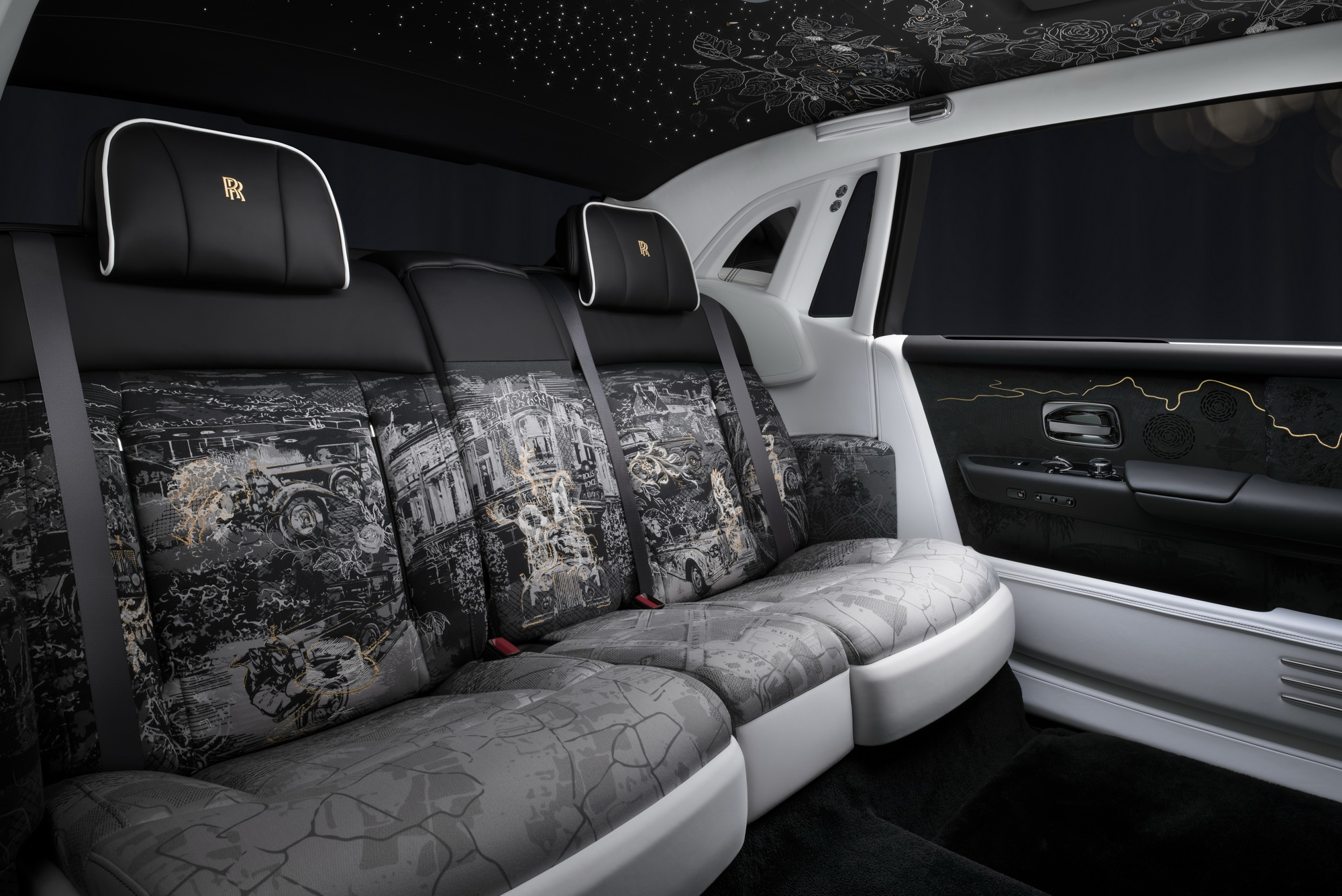 Το ύφασμα της καμπίνας κοσμείται από πάνω από 160.000 ραφές σε 45 ξεχωριστά πάνελ. Οι εσωτερικές επενδύσεις των θυρών αναπαριστούν τα ταξίδια του Henry Royce, με χάρτες φτιαγμένους από φύλλα χρυσού.