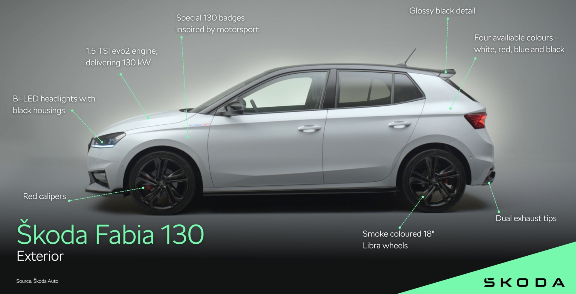Με τον κινητήρα 1.5 TSI να αποδίδει 177 ίππους (130 kW) και τελική ταχύτητα 228 km/h, το Fabia 130 γίνεται το ταχύτερο μοντέλο Fabia στην ιστορία της Škoda. Η νέα ειδική έκδοση διατίθεται προς παραγγελία σε πολλές ευρωπαϊκές αγορές, με τις πρώτες παραδόσεις να ξεκινούν τον Δεκέμβριο του 2025.