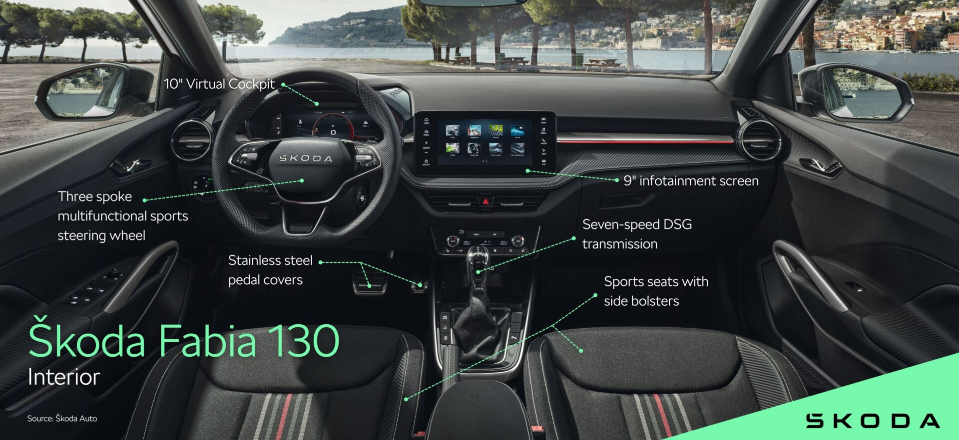 Το Fabia 130 διαθέτει επίσης σύστημα δυναμικού ελέγχου δύο σταδίων, με Normal και Sport ρύθμιση για το traction control και σύστημα ελέγχου της ευστάθειας. Η εξωτερική σχεδίαση περιλαμβάνει γυαλιστερά μαύρα στοιχεία, φώταBi-LED, διπλές μπούκες εξάτμισης και ειδικά σήματα «130», ενώ η καμπίνα συνδυάζει ηλεκτρικά ρυθμιζόμενα σπορ καθίσματα, τριάκτινο τιμόνι, Virtual Cockpit 10” και προαιρετική οθόνη infotainment 9”.