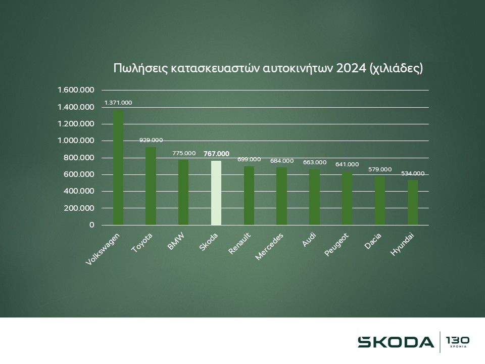 Η τσεχική φίρμα πέτυχε την υψηλότερη ετήσια αύξηση πωλήσεων (+12,7%) ανάμεσα στις δέκα κορυφαίες μάρκες στην Ευρώπη, ξεπερνώντας παραδοσιακές δυνάμεις της αγοράς. Αξίζει δε να αναφέρουμε πως το 2024, η εταιρεία σημείωσε τα υψηλότερα έσοδα στην ιστορία της. 27,8 δισ. ευρώ, με λειτουργικά κέρδη που άγγιξαν τα 2,3 δισ. ευρώ και απόδοση επί των πωλήσεων 8,3%.