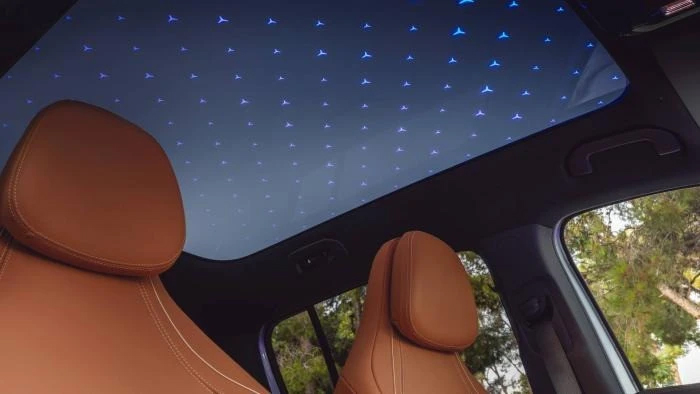 Αυτό που επίσης εντυπωσιάζει, η νέα γυάλινη ηλεκτροχρωματική πανοραμική οροφή που με το πάτημα ενός κουμπιού φανερώνει φωτεινά μοτίβα αστεριών. Αναβαθμίσεις υπάρχουν και στο head-up display που προβάλλει με καθαρά γραφικά όλες τις χρήσιμες πληροφορίες στο οπτικό πεδίο του οδηγού.