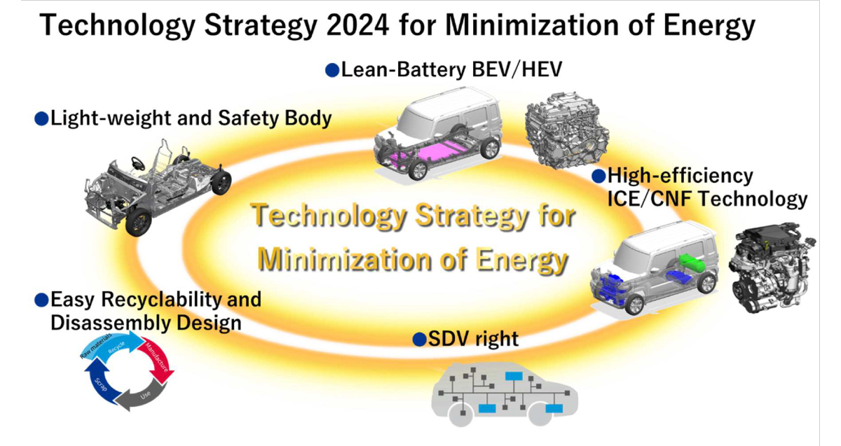 Έχοντας στόχο να παρέχει στους πελάτες της τα πιο αποδοτικά EV, με βάση τον λόγο ενέργειας που προέρχεται από ανανεώσιμες πηγές και τις συνθήκες χρήσης σε κάθε χώρα και περιοχή, η Suzuki θα εξελίσσει ηλεκτρικά αυτοκίνητα που ελαχιστοποιούν την κατανάλωση ενέργειας, συνδυάζοντας εξαρτήματα που ενσωματώνουν τη φιλοσοφία «Sho-Sho-Kei-Tan-Bi», όπως μια μικρή και αποδοτική ηλεκτρική μονάδα και μια μικρή σε μέγεθος και ελαφριά μπαταρία.