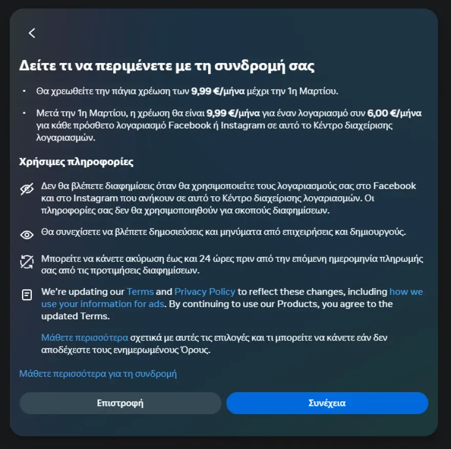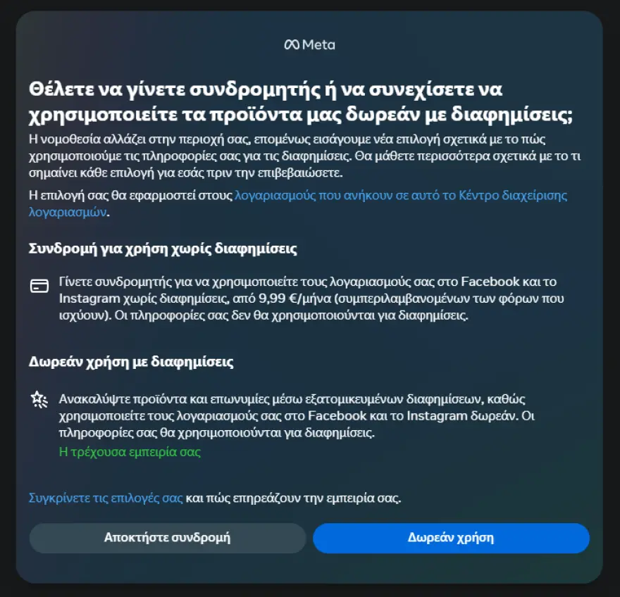 Η Meta στέλνει ειδοποίηση σε όλους τους χρήστες των δύο δικτύων για τις επιλογές που έχουν, είτε να πρόσβαση δωρεάν με τα δεδομένα τους να χρησιμοποιούνται για στοχευμένες διαφημίσεις ή να πληρώνουν μηνιαία για να μη βλέπουν διαφημίσεις.