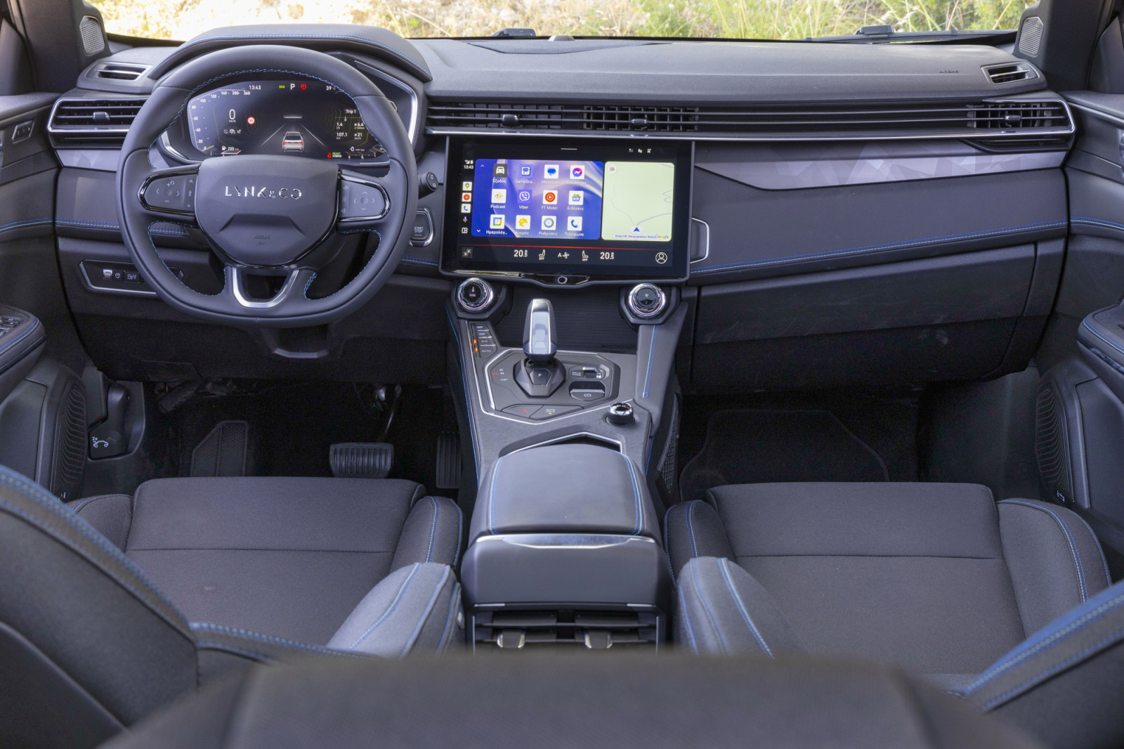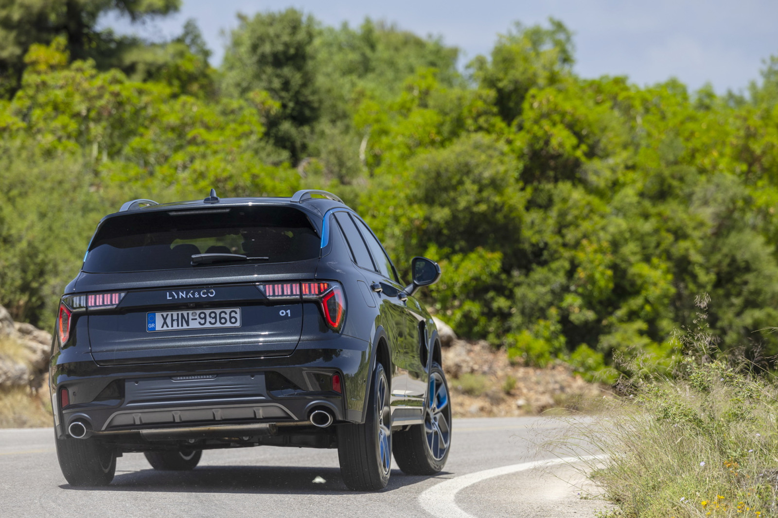 To Lynk & Co 01 που μας έδωσαν ήταν σε χρώμα Onyx Black (το άλλο χρώμα είναι το μπλε), ενισχυμένo με μπλε ελεκτρίκ στο περίγραμμα των παραθύρων, στη μάσκα και στις ζάντες. Με διαστάσεις 4,54 m σε μήκος, 1,85 σε πλάτος και 1,68 m σε ύψος, τοποθετείται στην κατηγορία των κόμπακτ ή C-SUV. Οπότε, ικανό για μακρινές αποστάσεις και ταυτόχρονα ικανοποιητικά προσαρμοσμένο στο αστικό περιβάλλον. Με τα εξωτερικά φινιρίσματα να είναι σε κάθε περίπτωση πολύ καλά, ανταποκρινόμενα στις premium φιλοδοξίες της Lynk & Co.