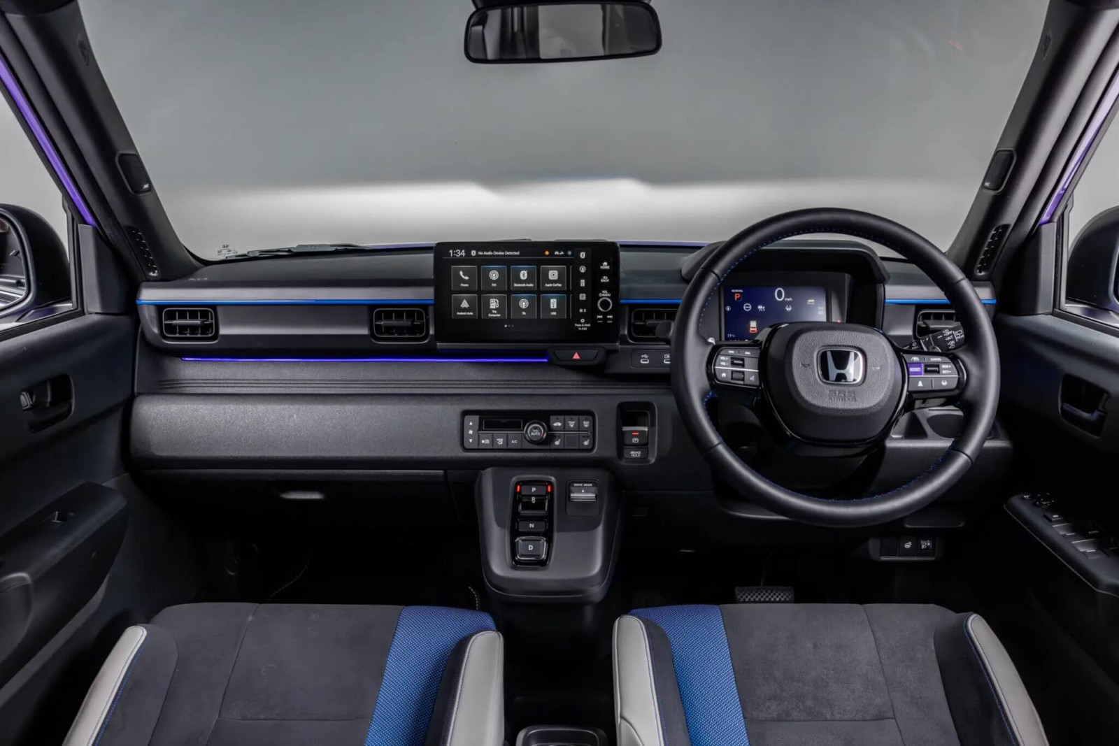 Στο εσωτερικό, το Honda Super-N έχει τονισμένα πλαϊνά στα καθίσματα, μπλε λεπτομέρειες και ατμοσφαιρικό φωτισμό που αλλάζει σε μωβ όταν πατάς τη λειτουργία Boost Mode.