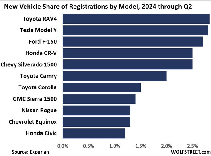 Στην 4η θέση βρίσκεται άλλο ένα SUV, το Honda CR-V, επιβεβαιώνοντας τη σχετική απομάκρυνση των Αμερικανών από τις καρότσες. Ακολουθεί η Chevrolet Silverado, δύο Toyota — Camry και Corolla, το GMC Sierra 1500, το θηριώδες Nissan Rogue, η Chevrolet Equinox και το Honda Civic.
