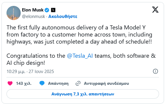Στα τέλη του περασμένου μήνα, ο Musk ανακοίνωσε ότι η πρώτη πλήρως αυτόνομη παράδοση ενός Tesla θα λάμβανε χώρα στις 28 Ιουνίου. Τελικά έγινε μία μέρα νωρίτερα. Το πλάνο ήταν το αυτοκίνητο να βγει από τις γραμμές παραγωγής στο Gigafactory του Texas και να φτάσει σε έναν τοπικό αγοραστή, χωρίς τη βοήθεια κανενός επιβαίνοντος. Ή απομακρυσμένου τηλεχειρισμού.