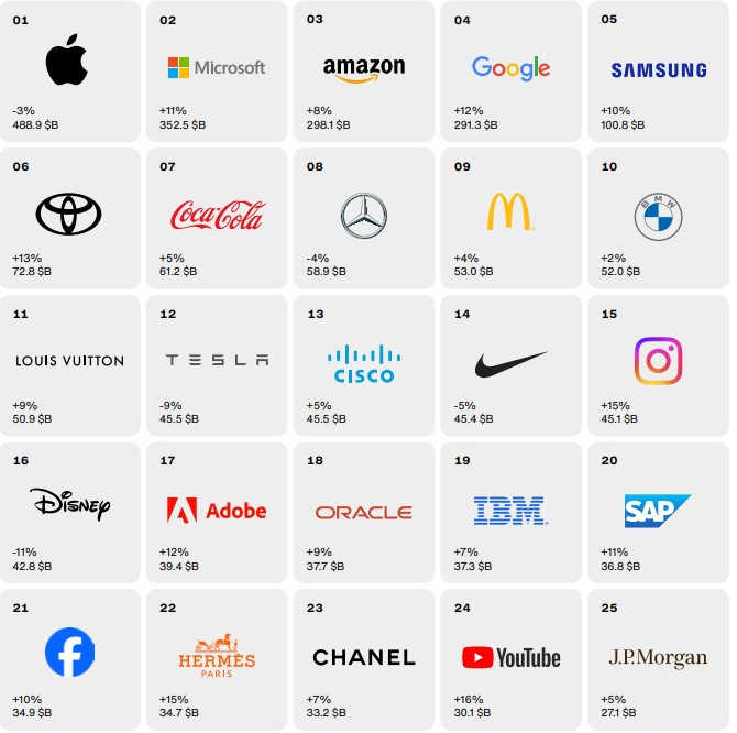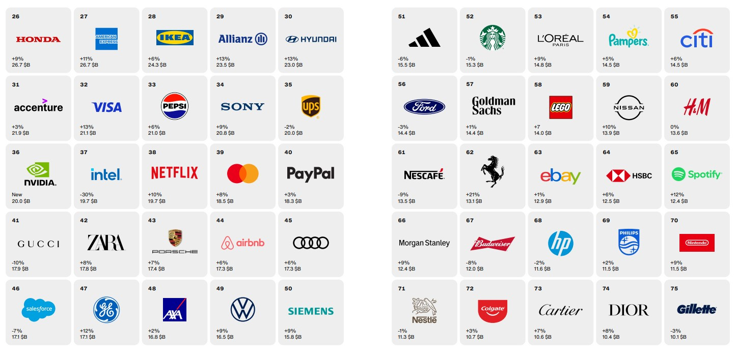 Πολύ κοντά στην πρώτη δεκάδα βρίσκεται και η Tesla, στη 12η θέση, με αξία 41,7 δισ. ευρώ. Στην λίστα υπάρχουν αρκετές ακόμα αυτοκινητοβιομηχανίες, όπως οι Honda (26η θέση), Hyundai (30η θέση), Porsche (43η θέση), Audi (45η θέση), VW (49η θέση), Ford (56η θέση), Nissan (59η θέση), Ferrari (62η θέση), Kia (86η θέση) και Range Rover (96η θέση). Με την βρετανική φίρμα να περιλαμβάνεται στην λίστα για πρώτη φορά.