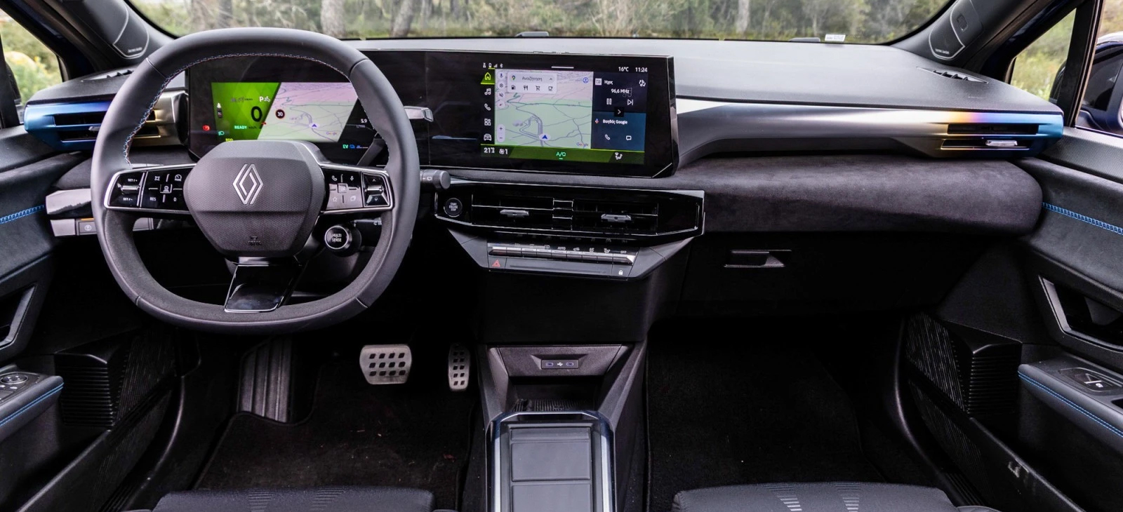 Η όμορφη σχεδίαση συνεχίζεται και στο πλάι, όπου η οροφή ακολουθεί μια πιο κουπέ λογική. Οι τροχοί, που μπορούν να φτάσουν μέχρι τις 18” γεμίζουν υποδειγματικά τους θόλους και οι κρυφές χειρολαβές στις πίσω πόρτες αποτελούν συνδετικό κρίκο ανάμεσα στο απερχόμενο και το νέο Clio. Στο πίσω μέρος, η ευμεγέθης αεροτομή και τα νέα φωτιστικά σώματα ολοκληρώνουν με τον καλύτερο τρόπο την φρέσκια και σπορτίβ εικόνα του νέου Clio. Είναι ένα από τα πιο καλαίσθητα και όμορφα σουπερμίνι της ελληνικής αγοράς και με τρόπο μεστό και μετρημένο δείχνει και είναι πιο πιο ώριμο και πιο premium από ποτέ, χωρίς να χάνει την ευελιξία και τις κόμπακτ διαστάσεις που το καθιστούν ιδανικό για την πόλη. Για του λόγου το ασφαλές, η νέα γενιά του Renault Clio πατά στην πλατφόρμα CMF-B και το μήκος φτάνει πλέον τα 4,12 m (+6,7 cm), τα 1,77 m σε πλάτος (+3,9 cm) και τα 1,45 m σε ύψος (+1 cm). Μεγαλύτερο, κατά έναν πόντο είναι και το μεταξόνιο, στα 2,59 m. Χωροταξικά λοιπόν τοποθετείται στο άνω άκρο της κατηγορίας. Ο αέρας για τα γόνατα και το κεφάλι των πίσω επιβατών είναι πολύ καλός και θα καλύψει χωρίς κανένα πρόβλημα τόσο τις ανάγκες ενός νέου ανθρώπου όσο κι εκείνες μιας μικρής οικογένειας. Το πόρτμπαγκαζ στις φουλ υβριδικές εκδόσεις χωρά 309 lt και φτάνει ως τα 1.094 lt με την αναδίπλωση της πίσω σειράς (391-1.176 λίτρα στις θερμικές εκδόσεις). Στα θετικά του, το πλήρως εκμεταλλεύσιμο σχήμα και το χαμηλό κατώφλι φόρτωσης που διευκολύνει σημαντικά την φόρτιση ογκωδών αντικειμένων. Πέρα όμως από τους χώρους, η συνολική εικόνα και παρουσίαση της καμπίνας σε προδιαθέτει θετικά καθώς είναι σημαντικά αναβαθμισμένη και σταθμισμένη στις ανάγκες του οδηγού. Ακολουθώντας τη λογική των μεγαλύτερων Austral και Rafale, ο ψηφιακός πίνακας οργάνων του φουλ υβριδικού Clio έχει διαγώνιο 10,1”. Προσφέρει πολλές δυνατότητες παραμετροποίησης -μπορείς να έχεις την πλοήγηση στο οπτικό σου πεδίο- και οι απεικονίσεις του είναι κρυστάλλινες. Παράλληλα, η κεντρική οθόνη του συστήματος πολυμέσων OpenR Link, επίσης 10,1”, λειτουργεί με ενσωματωμένο λογισμικό Google. Έτσι επιτρέπει χρήση εφαρμογών όπως Google Maps και Google Assistant, αλλά και πλήρη ασύρματη συνδεσιμότητα μέσω Android Auto και Apple CarPlay. Το μενού είναι διαισθητικό και λογικά διαρθρωμένο και το όλο σύστημα εύχρηστο όπως ένα Android smartphone. Tα γραφικά είναι κι εδώ κορυφαία, η απόκριση στις εντολές ταχύτατη ενώ στα θετικά, το γεγονός ότι υποστηρίζει και ελληνικό μενού. Η ψηφιοποίηση της καμπίνας του Renault Clio δεν έρχεται σε βάρος της εργονομίας μιας και υπάρχουν φυσικοί διακόπτες για τον χειρισμό των βασικότερων λειτουργιών, περιλαμβανομένου και το κλιματισμού. Η αίσθηση ποιότητας που αποκομίζεις από την καμπίνα είναι αντάξια ενός μοντέλου Renault. Δεν μιλάμε μόνο για τις επενδύσεις από Alcantara (!) στην πλούσια έκδοση esprit Alpine αλλά για τον τρόπο που οι Γάλλοι έχουν μελετήσει και ταιριάξει τα πάντα. Η συναρμογή και το μονταρίσμα είναι καλοφροντισμένα και η στιβαρότητα της κατασκευής σε πείθει πως τα πλαστικά θα αντέξουν στον χρόνο και την καθημερινή χρήση. Μια ανεπιτήδευτη αίσθηση πολυτέλειας δίνει τόσο ο νέος ambient φωτισμός όσο και το ηχοσύστημα της Harman/Kardon που έχει εξελιχθεί αποκλειστικά για το Clio σε συνεργασία με τον Jean-Michel Jarre. Ένα από τα μεγαλύτερα προτερήματα του νέου Renault Clio Full hybrid E-Tech είναι το υβριδικό του σύστημα, το οποίο προσφέρει όλα τα πλεονεκτήματα των ηλεκτροκινητήρων: αθόρυβη εκκίνηση, αμιγώς ηλεκτρική οδήγηση μ