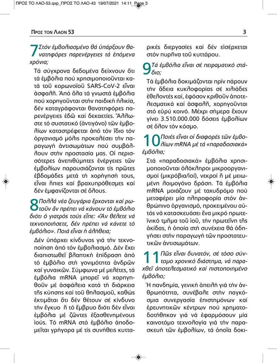 Απευθυνόμενο «προς το λαό», το φυλλάδιο της Εκκλησίας της Ελλάδος επιγράφεται «οι χριστιανοί μας ρωτούν για το εμβόλιο και οι γιατροί μας απαντούν», με στόχο να καταπέσουν μύθοι και θεωρίες συνωμοσίας που εξυφαίνονται στη δημόσια σφαίρα, συσκοτίζοντας την αλήθεια.