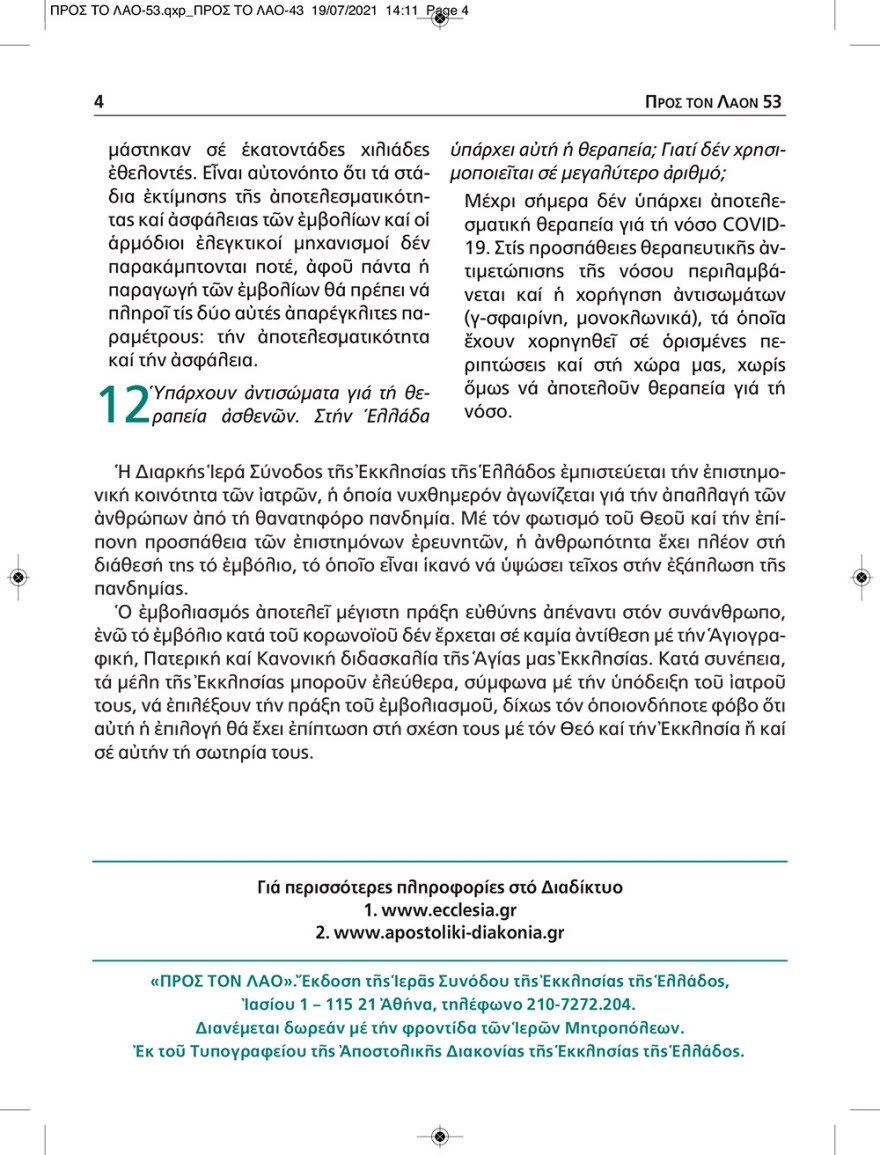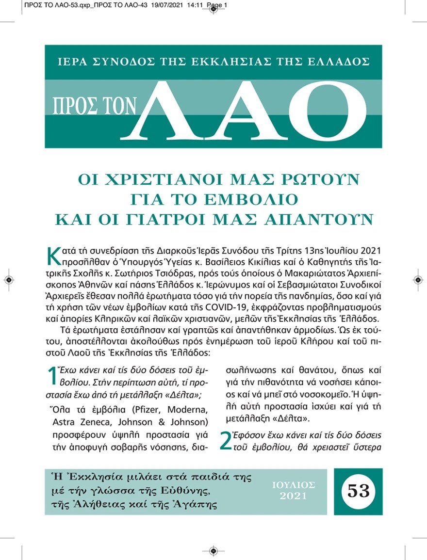 Ένα φυλλάδιο με ερωτήσεις και απαντήσεις προωθεί στους κατά τόπους ναούς η Εκκλησία της Ελλάδος, συνδράμοντας στην πράξη την πανελλαδική εκστρατεία ενημέρωσης υπέρ του εμβολιασμού για τον COVID19, μετά από σχετικό αίτημα του Πρωθυπουργού, Κυριάκου Μητσοτάκη.
