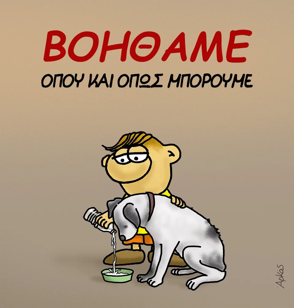 Στο νέο του σκίτσο λοιπόν, φαίνεται ένα σκυλί κουρασμένο να περιμένει να δροσιστεί. «Βοηθάμε όπως και όπου μπορούμε», είναι το μήνυμα που συνοδεύει το εν λόγω σκίτσο.