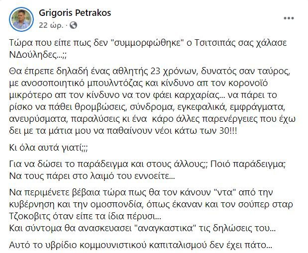 «Τώρα που είπε πως δεν “συμμορφώθηκε” ο Τσιτσιπάς σας χάλασε ΝΔούληδες; Θα έπρεπε δηλαδή ένας αθλητής 23 χρόνων, δυνατός σαν ταύρος, με ανοσοποιητικό μπουλντόζας και κίνδυνο από τον κορονοϊό μικρότερο από τον κίνδυνο να τον φάει καρχαρίας… να πάρει το ρίσκο να πάθει θρομβώσεις, σύνδρομα, εγκεφαλικά, εμφράγματα, ανευρύσματα, παραλύσεις κι ένα κάρο άλλες παρενέργειες που έχω δει με τα μάτια μου να παθαίνουν νέοι κάτω των 30!