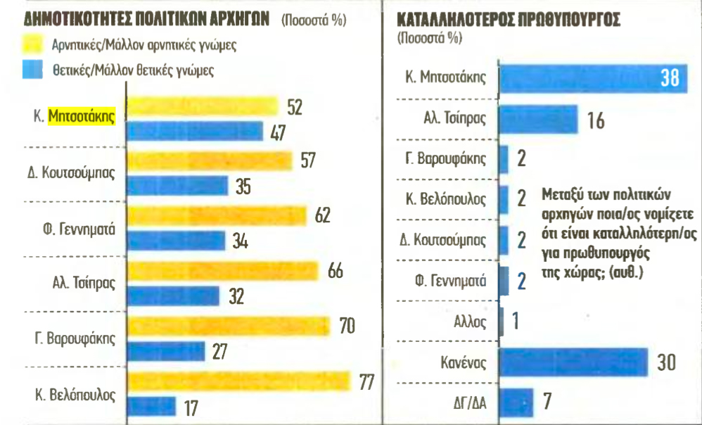 Στην καταλληλότητα για πρωθυπουργός, ο Κυριάκος Μητσοτάκης προηγείται με 38%, έναντι 16% του Αλέξη Τσίπρα. Ο «κανένας» είναι… δεύτερος με 30%.