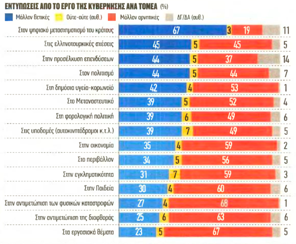 Οι αρνητικές γνώμες για την κυβέρνηση, πάντως, φτάνουν στο 54%, έναντι 39% των θετικών, με τον ψηφιακό μετασχηματισμό να… σώζει τα προσχήματα (67% θετικές γνώμες). Μαζί με τις θετικές γνώμες για την κυβέρνηση, υποχωρούν και εκείνες για τον πρωθυπουργό (43% από 49% τον Ιούλιο).
