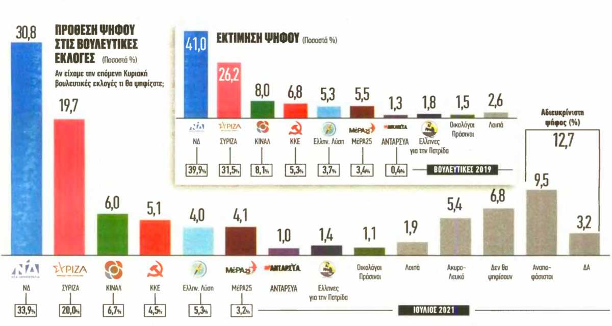Στην πρόθεση ψήφου η Νέα Δημοκρατία λαμβάνει 30,8% έναντι 19,7% του ΣΥΡΙΖΑ (41% – 26,1% τα αντίστοιχα ποσοστά στην εκτίμηση ψήφου).