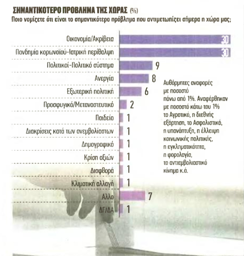 Ως σημαντικότερα προβλήματα αξιολογούνται η οικονομία, η ακρίβεια και η πανδημία (30%). Το 49% των ερωτηθέντων εκτιμά ότι τους επόμενους μήνες οι οικονομικές συνθήκες θα επιδεινωθούν και μόνο το 25% πιστεύει ότι τα πράγματα θα πάνε καλύτερα.