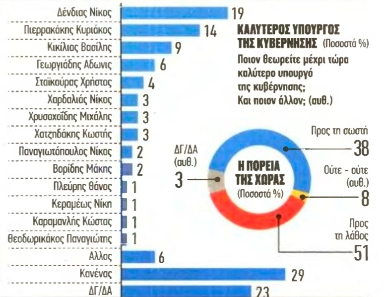 Όσον αφορά στην αξιολόγηση των υπουργών, ο Νίκος Δένδιας είναι ο πιο δημοφιλής με τις θετικές γνώμες να είναι στο 19% για τον υπουργό Εξωτερικών. Ακολουθεί ο υπουργός Ψηφιακής Διακυβέρνησης, Κυριάκος Πιερρακάκης, με 14% και ακολουθούν οι Βασίλης Κικίλιας, Άδωνις Γεωργιάδης, Χρήστος Σταϊκούρας, Νίκος Χαρδαλιάς, με τις θετικές γνώμες να είναι κάτω του 10%.