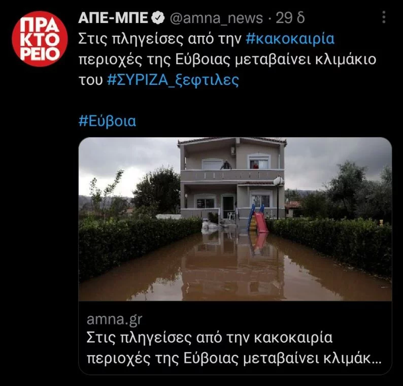 Την παραίτηση του προέδρου του ΑΠΕ, Αιμίλιου Περδικάρη ζητά με ανακοίνωσή του ο ΣΥΡΙΖΑ, με αφορμή ένα hashtag του Αθηναϊκού-Μακεδονικού Πρακτορείου το οποίο συνόδευσε το tweet της είδησης για την επίσκεψη κλιμακίου του κόμματος στην Βόρεια Εύβοια που δοκιμάζεται από τις πλημμύρες.