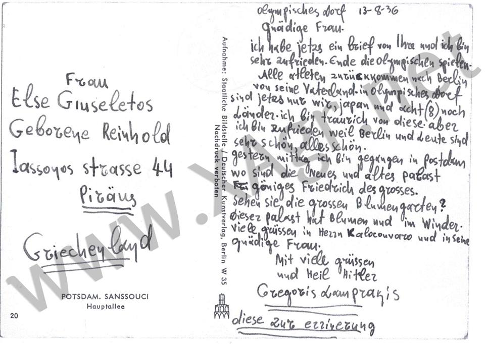 Στη μία φωτογραφία ο Λαμπράκης χαιρετάει «φασιστικά» κατά τη διάρκεια των Βαλκανικών Αγώνων στην Κωνσταντινούπολη, στις 20 Οκτωβρίου 1940, «…8 μέρες πριν μας κηρύξουν τον πόλεμο οι Ιταλοί», όπως χαρακτηριστικά γράφει ο ίδιος, στο ιδιόχειρο σημείωμά του στο πίσω μέρος της εικόνας. Πολύ μεγαλύτερο σοκ όμως, ίσως πάθουν οι απανταχού «αντιφασίστες» με την κάρτα την οποία απέστειλε από την Γερμανία στις 13 Αυγούστου 1936, περίοδο προφανώς διεξαγωγής των Ολυμπιακών Αγώνων του Βερολίνου. Ο Γρηγόρης Λαμπράκης περιγράφει στην Ελληνίδα φίλη του, στην οποία έστειλε την κάρτα, την κατάσταση στη Γερμανία και τελειώνει την προσφώνησή του με το σύνθημα Heil Hitler!
