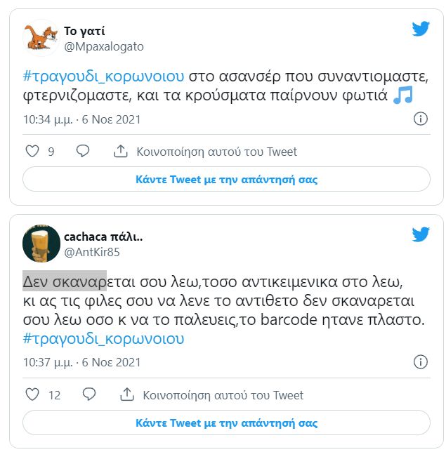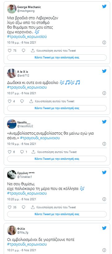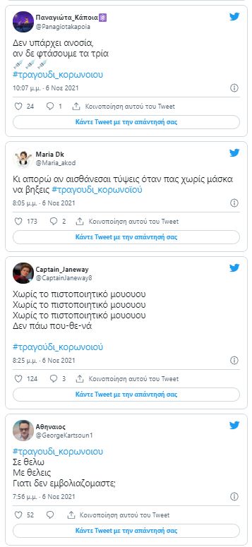 Στην κορυφή των trends βρίσκεται τα τελευταία 24ωρα το hashtag #σειρά_κορωνοϊού, καθώς οι πολίτες διακωμωδούν τα νέα μέτρα με στίχους από τραγούδια.