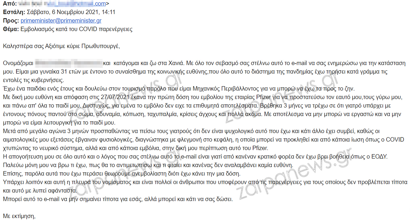 Επιστολή στον πρωθυπουργό Κυριάκος Μητσοτάκη έστειλε μια 31χρονη Χανιώτισσα η οποία παλεύει τους τελευταίους μήνες από τις παρενέργειες που της προκάλεσε το εμβόλιο της Pfizer.