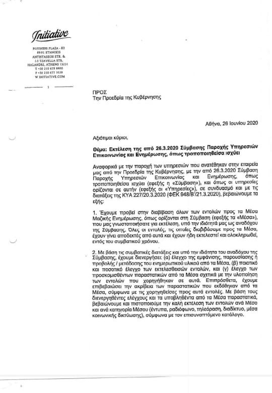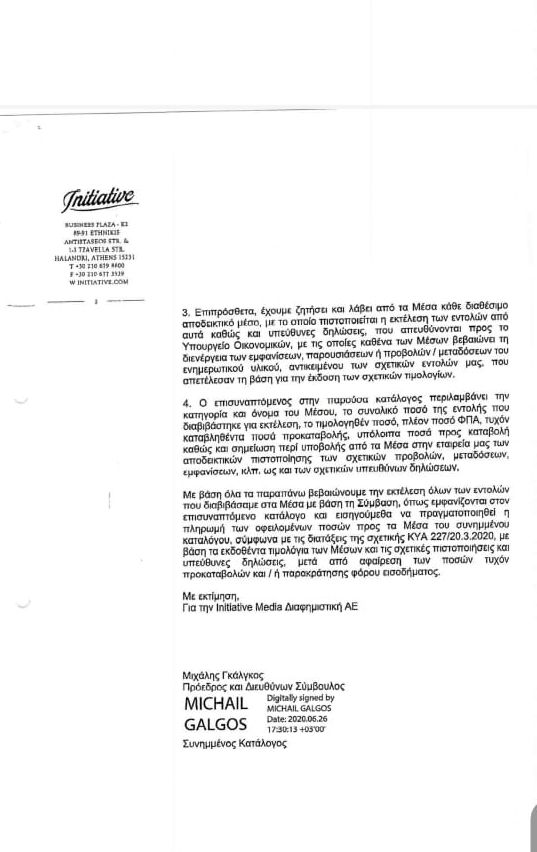 Από την επιστολή, η οποία επαναλαμβάνουμε είναι με ψηφιακή υπογραφή του Προέδρου και διευθύνοντος συμβούλου της διαφημιστικής, Μιχαήλ Γκάλγκου, αποτελεί προφανώς μία προσπάθεια απόσεισης των δεδομένων ευθυνών της εταιρείας, καθώς αναφέρει ότι «η επιλογή των ΜΜΕ και των ποσών που έλαβαν, είναι επιλογή της κυβέρνησης και όχι της Initiative»!