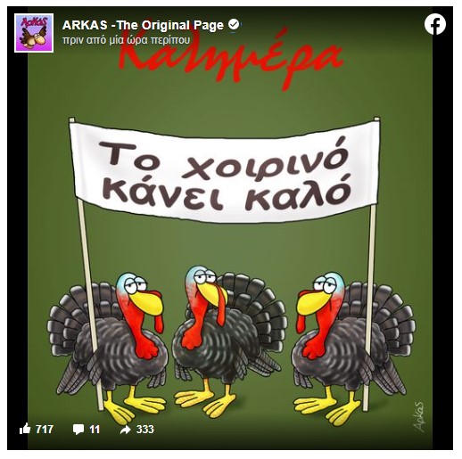 Ο σκιτσογράφος επιλέγει να πει «καλημέρα» με τρεις γαλοπούλες -το εκλεκτό έδεσμα των Χριστουγέννων- οι οποίες διαδηλώνουν υπέρ… του χοιρινού.