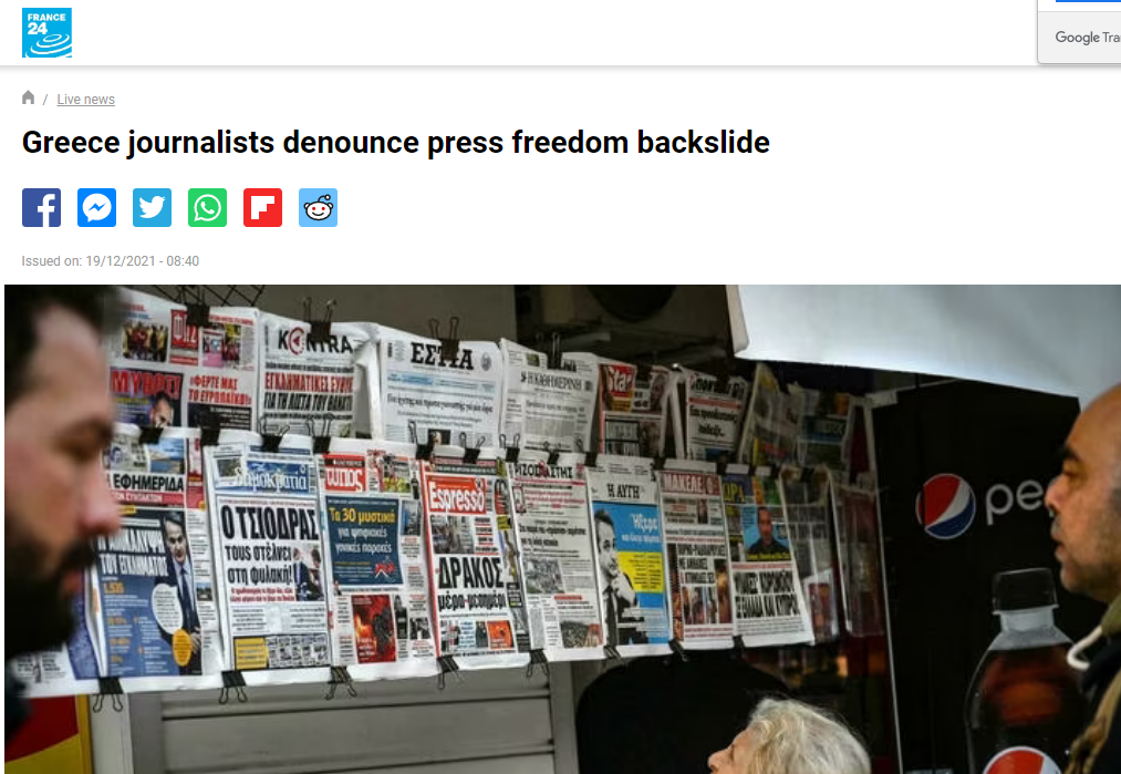 Το γαλλικό FRANCE24 γράφει σε χθεσινό του άρθρο, πως η Ελλάδα «έπεσε πέντε θέσεις στον Παγκόσμιο Δείκτη Ελευθερίας του Τύπου για το 2021 που συνέταξε η οργάνωση Ρεπόρτερ Χωρίς Σύνορα (RSF) και τώρα κατατάσσεται στην 70η θέση σε σύνολο 180 χωρών, πίσω από την Πολωνία και την Μογγολία. Ο Γιώργος Πλειός, επικεφαλής σπουδών ΜΜΕ στο Εθνικό Πανεπιστήμιο Αθηνών, λέει ότι η επιδείνωση τον περασμένο χρόνο ήταν ανησυχητική. ‘Η ελευθερία του Τύπου έχει γίνει ανησυχητική’», είπε στο Γαλλικό Πρακτορείο.