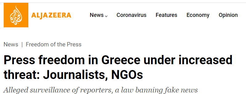 Μέχρι και το Al Jazeera έφτασε να γράφει: «Η ελευθερία του Τύπου στην Ελλάδα βρίσκεται υπό αυξημένη απειλή: Παρακολούθηση δημοσιογράφων, νόμος που απαγορεύει τις ψεύτικες ειδήσεις και εκφοβισμός τροφοδοτεί τις ανησυχίες».