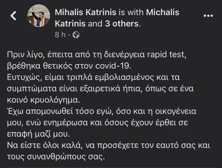 Ο επικεφαλής της Κοινοβουλευτικής Ομάδας του Κινήματος Αλλαγής, Μιχάλης Κατρίνης, ανακοίνωσε μέσω ανάρτησής του στο facebook, πως βρέθηκε θετικός στην COVID-19.