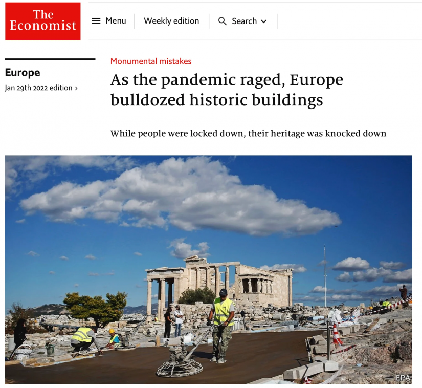 Αναφερόμενο στην Ακρόπολη, Το θέμα που τιτλοφορείται: «Ενώ η πανδημία σάρωνε, η Ευρώπη γκρέμιζε ιστορικά κτίρια» και έχει υπέρτιτλο «Μνημειώδη λάθη», διασύρει την Ελλάδα και την κυβέρνηση Μητσοτάκη για τον τρόπο με τον οποίο προχωρά σε εφαρμογή πολιτικών υπό το «παραπέτασμα καπνού» της πανδημίας, αναφέρεται και σε άλλες περιπτώσεις αμφιλεγόμενων καταστροφών ιστορικών κτιρίων στην Ευρώπη, που προκάλεσαν μεγάλες αντιδράσεις των πολιτών, όπως η κατεδάφιση του παλιού Εθνικού Θεάτρου στα Τίρανα και του μοναδικού y-Block στο μινιμαλιστικής αισθητικής του 1960 συγκρότημα κυβερνητικών κτιρίων του Όσλο.