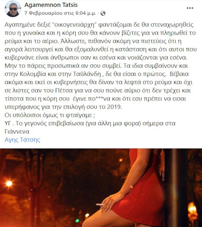 Στην σεξιστική ανάρτησή του ο Αγαμέμνονας Τάτσης αναφέρει χαρακτηριστικά: «Αγαπημένε δεξιέ ”οικογενειάρχη” φαντάζομαι δε θα στεναχωρηθείς που η γυναίκα και η κόρη σου θα κάνουν βίζιτες για να πληρωθεί το ρεύμα και το αέριο», συγκρίνοντας την Ελλάδα με τη Κολομβία και την Ταϊλάνδη.