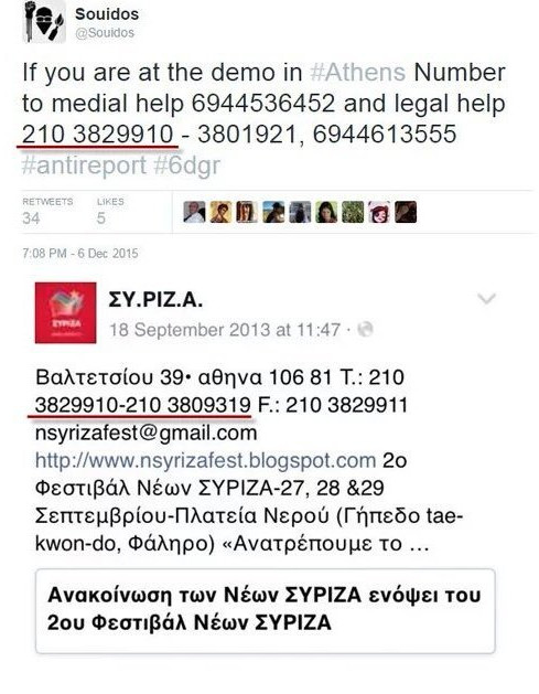 Πώς ξεκίνησε όμως η ιστορία με το συγκεκριμένο hastang; Στο Τwitter κυκλοφόρησε η είδηση πως όσοι αντιμετωπίσουν πρόβλημα είτε υγείας (τραυματισμοί κλπ), είτε νομικό (προσαγωγή, σύλληψη) κατά τη διάρκεια των επεισοδίων στην πορεία, θα μπορούσαν να καλέσουν σε ένα τηλεφωνικό αριθμό προκειμένου να ζητήσουν βοήθεια. Συγκεκριμένα το tweet ανέφερε « If you are at the demo in #Athens Number to medial help 6944536452 and legal help 210 3829910 – 3801921, 6944613555». Στη συνέχεια όμως προφανώς κάποιοι αναζήτησαν τους συγκεκριμένους τηλεφωνικούς αριθμούς και, όπως τουλάχιστον αναφέρουν οι ίδιοι, ανήκουν στον ΣΥΡΙΖΑ. Συγκεκριμένα και σύμφωνα με τις αναρτήσεις στο Twitter πρόκειται για τηλεφωνικούς αριθμούς σε γραφεία φεστιβάλ νεολαίας του ΣΥΡΙΖΑ με γραφεία στην οδό Βαλτετσίου όπως δείχνει και το παρακάτω tweet.