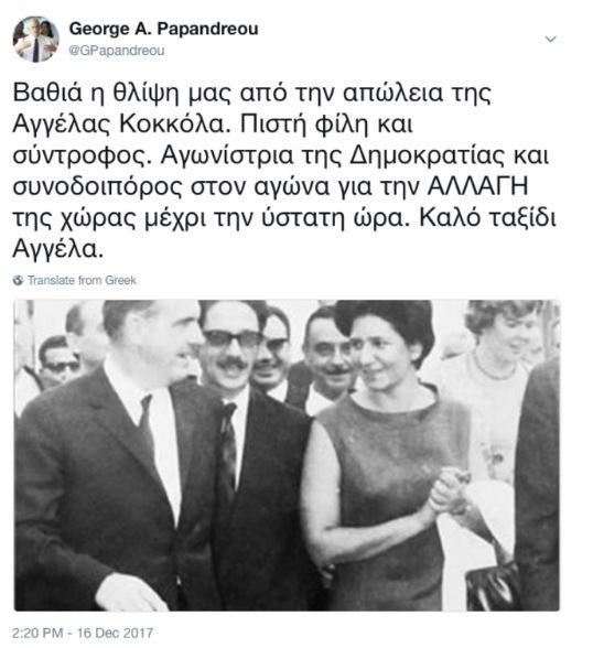«Βαθιά η θλίψη μας από την απώλεια της Αγγέλας Κοκκόλα. Πιστή φίλη και σύντροφος. Αγωνίστρια της Δημοκρατίας και συνοδοιπόρος στον αγώνα για την ΑΛΛΑΓΗ της χώρας μέχρι την ύστατη ώρα. Καλό ταξίδι Αγγέλα», αναφέρει ο πρόεδρος του ΚΙΔΗΣΟ, Γιώργος Α. Παπανδρέου.