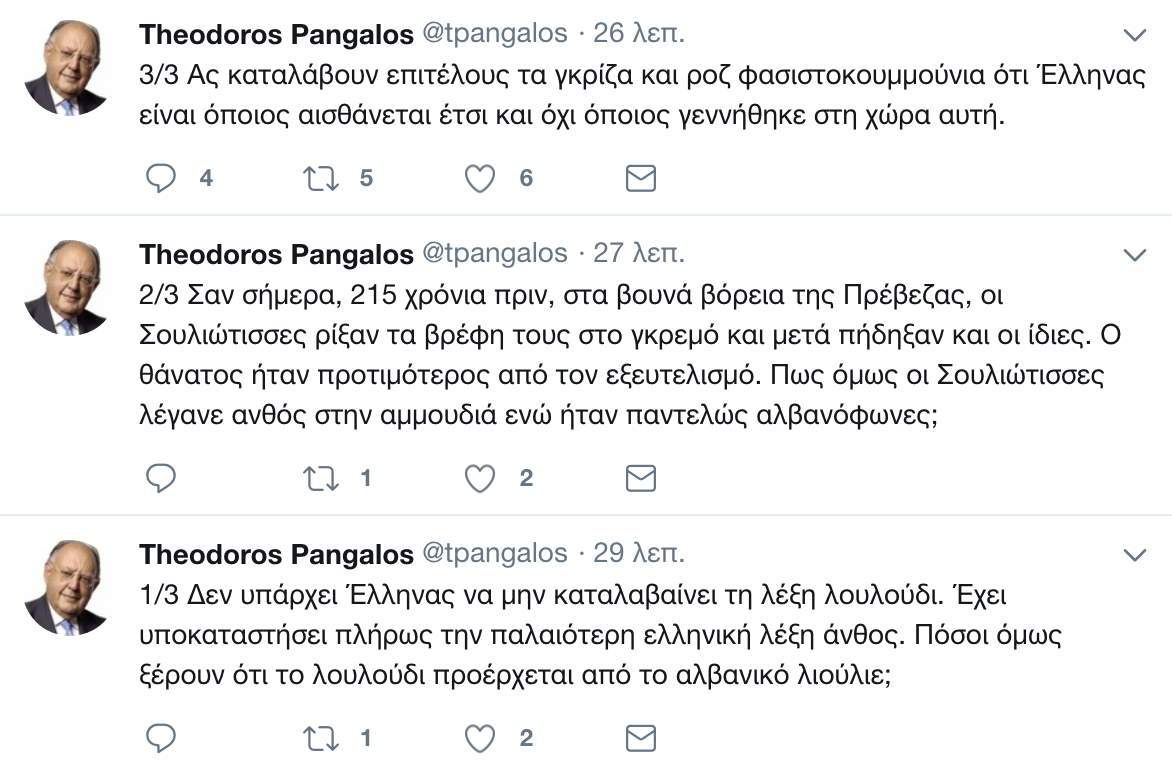 Για άλλη μια φορά ο τέως υπουργός του ΠΑΣΟΚ Θόδωρος Πάγκαλος ξανακτυπά και «βαφτίζει» τις Σουλιώτισσες Αλβανίδες με αναρτήσεις του στο Twitter.