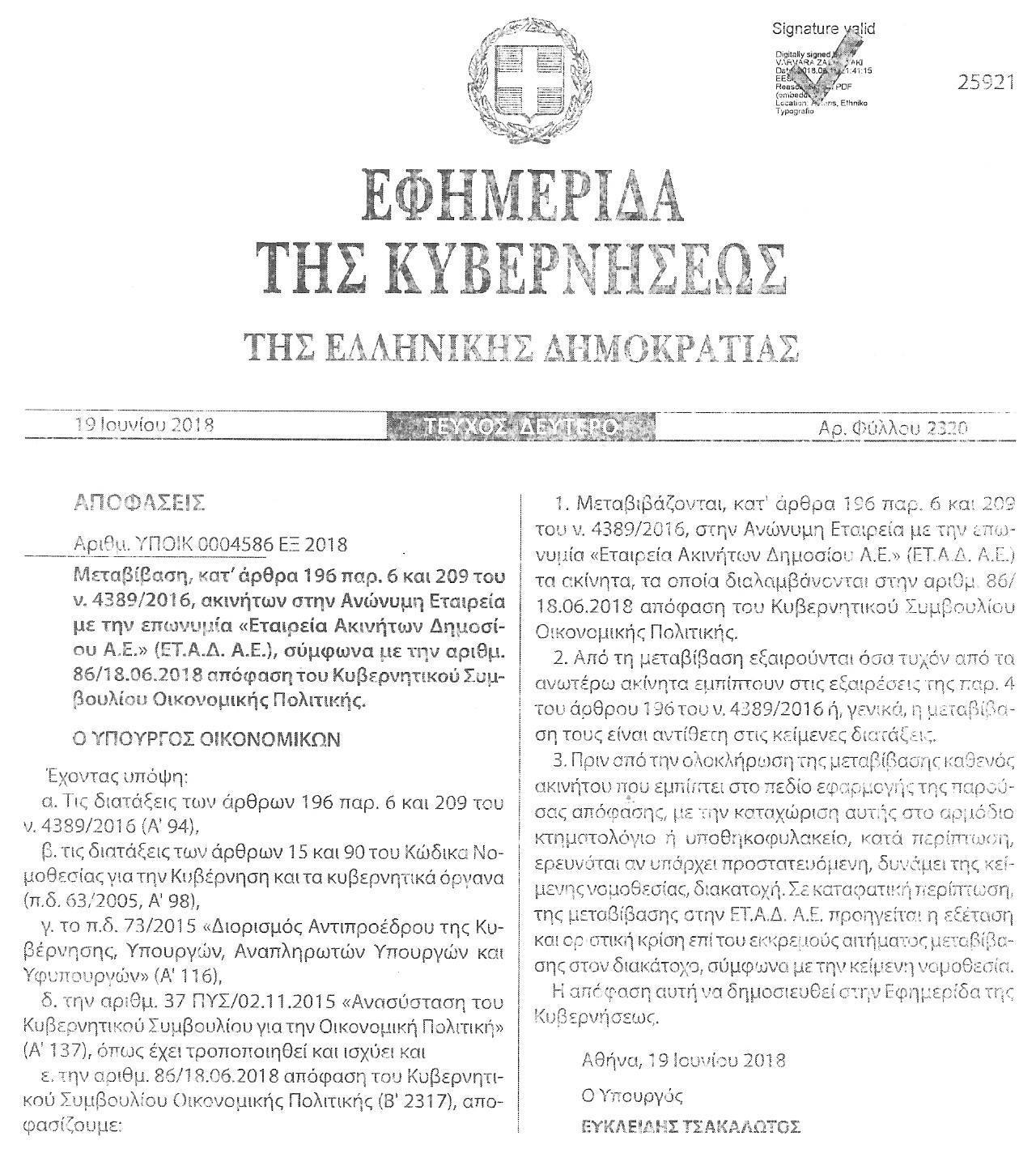 «Consultants have been hired by HCAP. The consultants of HCAP have requested more detailed data on the assets included in the national cadastre on the assets belonging to the state or to an unknown owner to HCAP so as to proceed with the screening process. The additional data has been provided to HCAP at the end of March and the screening has started. The identification of assets has been completed by the consultants. Following the identification, the list of the real estate assets to be transferred to HCAP was submitted to the Minister for approval. The Minister issued the relevant decision, following the relevant authorisation by KYSOIP (FEK B’ 2317/19.06.2018). The decision is the legal title for the transfer of the assets to ETAD/HCAP.»