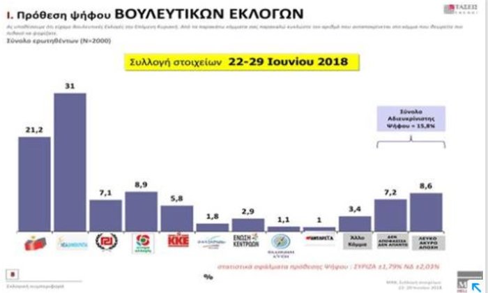 Έτσι στην πρόθεση ψήφου η ΝΔ συγκέντρωνε 31% ο ΣΥΡΙΖΑ 21,2%, ενώ η άλλη σημαντική αλλαγή ήταν η “αποκαθήλωση” της ΧΑ από την τρίτη θέση έναντι του ΚΙΝΑΛ με 8,9% για το τελευταίο και 7,1% για την πρώτη. Στα άλλο κόμματα το ΚΚΕ 5,8%, η Ένωση Κεντρώων 2,9%,οι Ανεξάρτητοι Έλληνες 1,8% και η Ελληνική Λύση 1,1%.