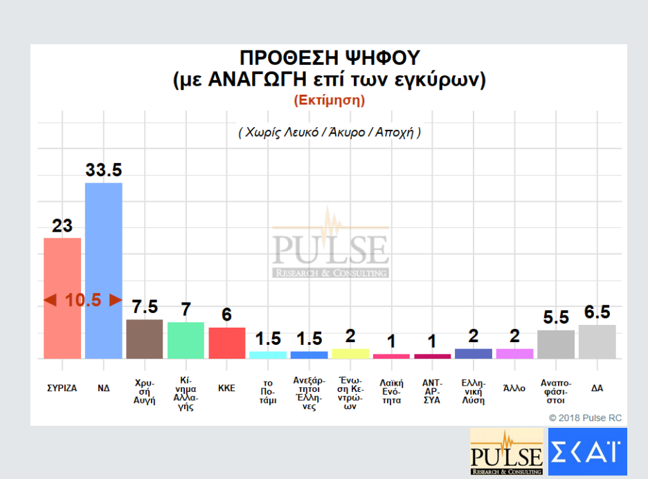 Τέλος στην πρόθεση ψήφου με αναγωγή η ΝΔ φτάνει τη διψήφια διαφορά με 33,5% έναντι 23% του ΣΥΡΙΖΑ.