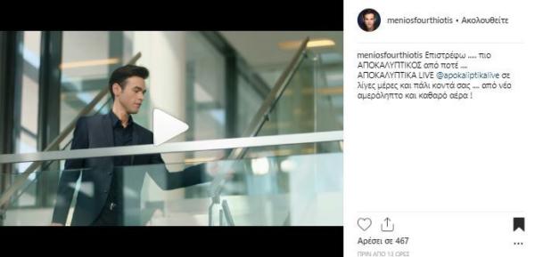 Έγραψε χαρακτηριστικά: «Επιστρέφω ….. πιο ΑΠΟΚΑΛΥΠΤΙΚΟΣ από ποτέ …. ΑΠΟΚΑΛΥΠΤΙΚΑ LIVE @apokaliptikalive σε λίγες μέρες και πάλι κοντά σας …. από νέο αμερόληπτο και καθαρό αέρα!»