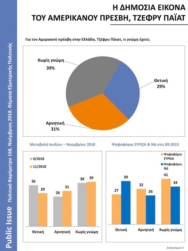 Στο ερώτημα «τι γνώμη έχετε για τον Αμερικανό πρέσβη» στην Αθήνα Τζέφρι Πάιατ, το 29% των ερωτηθέντων απαντά θετική, ενώ το 31% απαντά αρνητική.