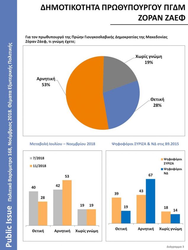 Επίσης η δημοτικότητα του πρωθυπουργού της ΠΓΔΜ Ζόραν Ζάεφ στην Ελλάδα δείχνει αρνητική καθώς το 53% των ερωτηθέντων απαντά ότι έχει αρνητική γνώμη, ενώ το 28% δηλώνει ότι έχει θετική γνώμη.