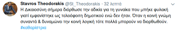 «Η Δικαιοσύνη σήμερα διόρθωσε την αδικία για τη γυναίκα που μπήκε φυλακή γιατί εμφανίστηκε ως τελειόφοιτη δημοτικού ενώ δεν ήταν». Αυτό αναφέρει σε ανάρτηση του ο Σταύρος Θεοδωράκης.