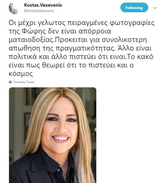Ειδικότερα, ο Κώστας Βαξεβάνης ανήρτησε την παρακάτω φωτογραφία της Φώφης Γεννηματά, σχολιάζοντας στο twitter: «Οι μέχρι γελωτος πειραγμένες φωτογραφίες της Φώφης δεν είναι απόρροια ματαιοδοξίας.Προκειται για συνολικοτερη απωθηση της πραγματικότητας. Άλλο είναι πολιτικά και άλλο πιστεύει ότι ειναι.Το κακό είναι πως θεωρεί ότι το πιστεύει και ο κόσμος».