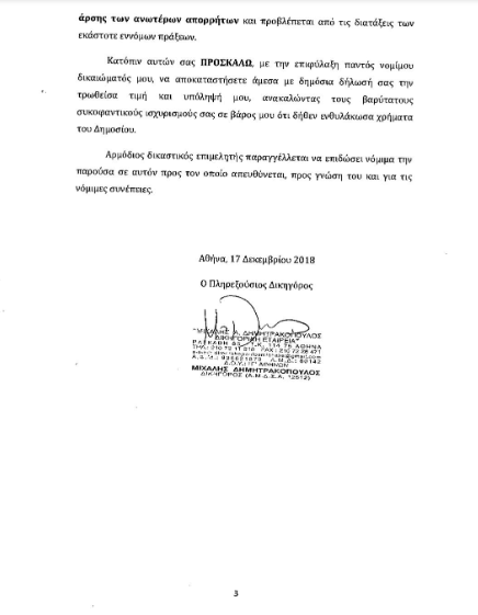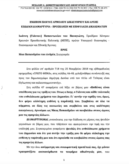 Συγκεκριμένα σύμφωνα με την εξώδικο διαμαρτυρία του πρώην υπουργού Γιάννου Παπαντωνίου, που βρίσκεται προφυλακισμένος στις γυναικείες φυλακές του Κορυδαλλού, ο Νίκος Παπανδρέου σε συνέντευξή του στην εφημερίδα το Πρώτο Θέμα υποστήριξε ότι «καθένας μας είναι υπεύθυνος για τις πράξεις του. Οπως ο Ακης, ο Γιάννος και κάθε πολιτικός που ενθυλάκωσε χρήματα του Δημοσίου.»
