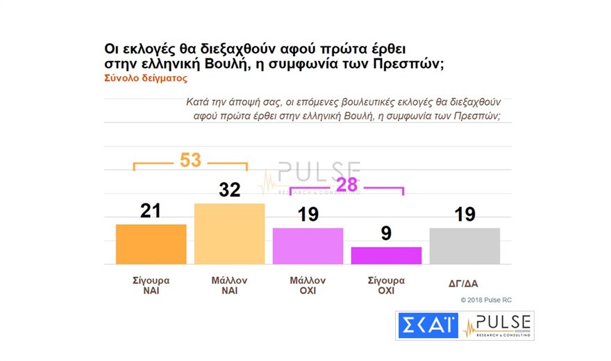 Παρά ταύτα σύμφωνα με δημοσκόπηση της Pulse που παρουσίασε το δελτίο ειδήσεων του ΣΚΑΙ, στην πρόθεση ψήφου, η Νέα Δημοκρατία καταγράφει προβάδισμα 9,5 ποσοστιαίων μονάδων συγκεντρώνοντας 31,5% (31% στη μέτρηση του Νοέμβρη) έναντι 22% (21%) του ΣΥΡΙΖΑ. Ακολουθούν η Χρυσή Αυγή και το Κίνημα Αλλαγής με 6,5% αντίστοιχα (7,5% και 7% το Νοέμβρη), το ΚΚΕ με 5,5% (6%), η Ένωση Κεντρώων με 2% και η Ελληνική Λύση με 2% αντίστοιχα (1,5% και 1,5%), το Ποτάμι με 1,5% και οι Ανεξάρτητοι Έλληνες (1%) και η ΑΝΤΑΡΣΥΑ με 1% (χωρίς καταγραφή στην προηγούμενη μέτρηση). Άλλο κόμμα, ψηφίζει το 4%, στο 16,5% η αδιευκρίνιστη ψήφος [αναποφάσιστοι και λευκό/άκυρο – στο 18,5% το Νοέμβρη). Παράλληλα, καταλληλότερος πρωθυπουργός αναδεικνύεται και πάλι ο πρόεδρος της ΝΔ Κυριάκος Μητσοτάκης με 36% έναντι 25% του Αλέξη Τσίπρα.