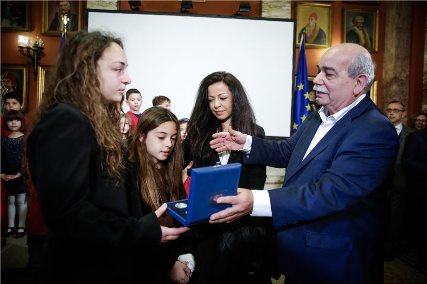 Ο πρόεδρος της Βουλής απένειμε στη σύζυγο του εκλιπόντος υποπλοίαρχου του Λιμενικού Σώματος, Κυριάκου Παπαδόπουλου, Ιγνατία Τικέλλη και στα δύο ανήλικα τέκνα του, τα τέσσερα αργυρά μετάλλια «Ήρωες Επανάστασης», τιμώντας έτσι «το μεγαλείο της παρουσίας και της δράσης του στα νερά του Αιγαίου, σώζοντας δεκάδες προσφυγόπουλα από τη θάλασσα».