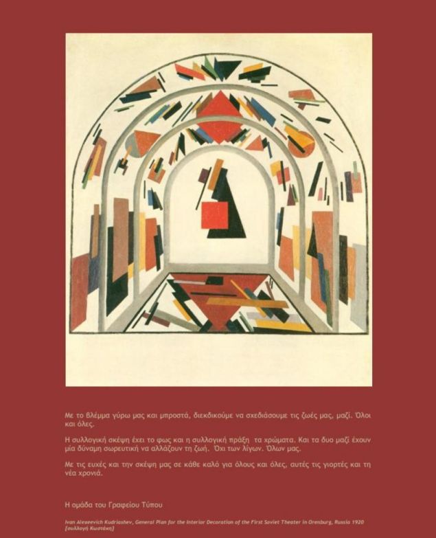 «Με το βλέμμα γύρω μας και μπροστά, διεκδικούμε να σχεδιάσουμε τις ζωές μας, μαζί. Ολοι και όλες. Η συλλογική σκέψη έχει το φως και η συλλογική πράξη τα χρώματα. Και τα δυο μαζί έχουν μία δύναμη σωρευτική να αλλάζουν τη ζωή. Οχι των λίγων. Ολων μας. Με τις ευχές και την σκέψη μας σε κάθε καλό για όλους και όλες, αυτές τις γιορτές και τη νέα χρονιά» αναφέρει η κάρτα του υπουργείου Οικονομικών, που απεικονίζει μια δημιουργία του Ιβάν Κουντριάσοφ (Αλεξέγιεβιτς) – με το πρώτο Σοβιετικό Θέατρο στην πόλη Όρενμπουργκ, ζωγραφισμένο το 1920.